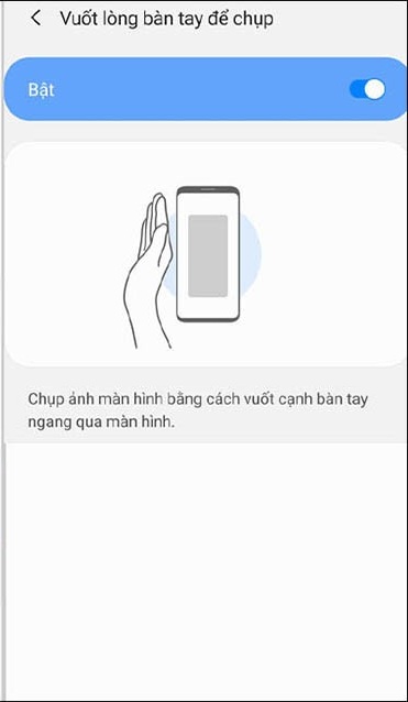 Cài đặt (Settings) > Tính năng nâng cao > Chuyển động và thao tác > chọn phần Vuốt lòng bàn tay để chụp: gạt sang phải để kích hoạt tính năng.