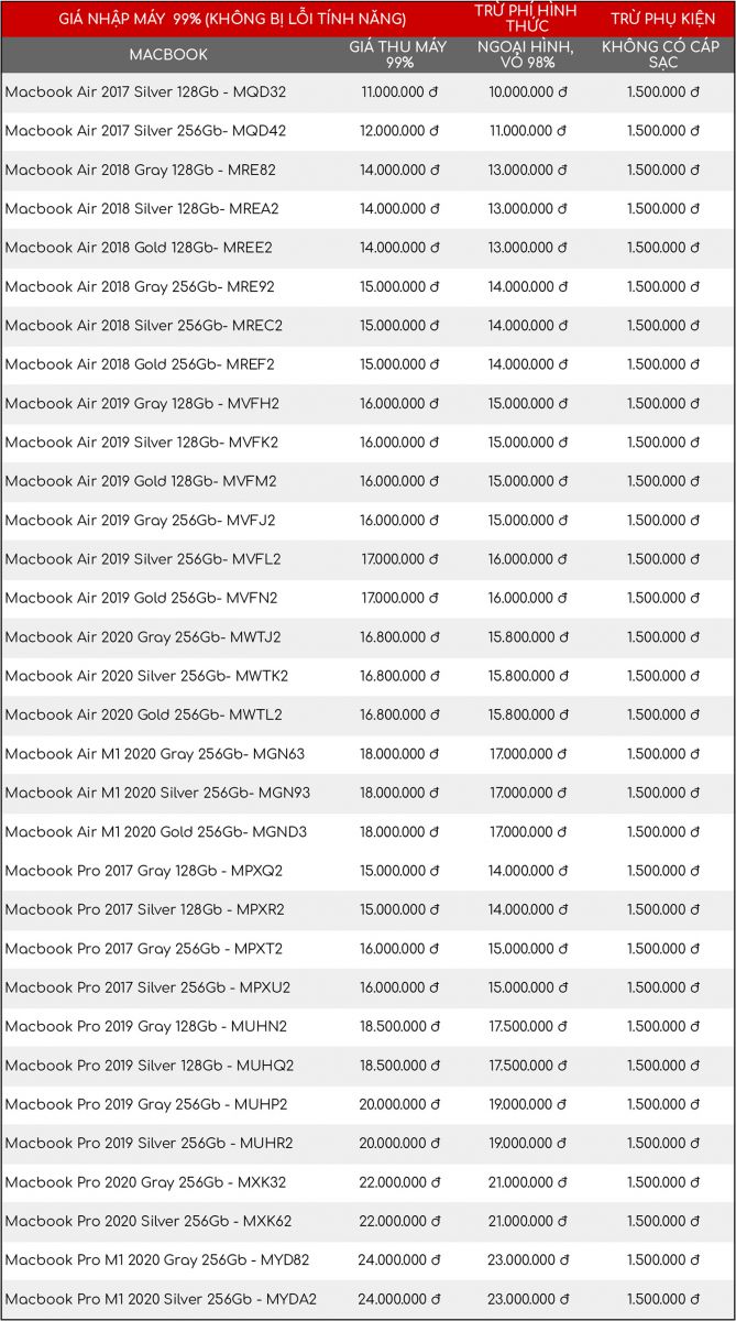 BẢNG GIÁ “THU CŨ - ĐỔI MỚI MACBOOK” THAM KHẢO